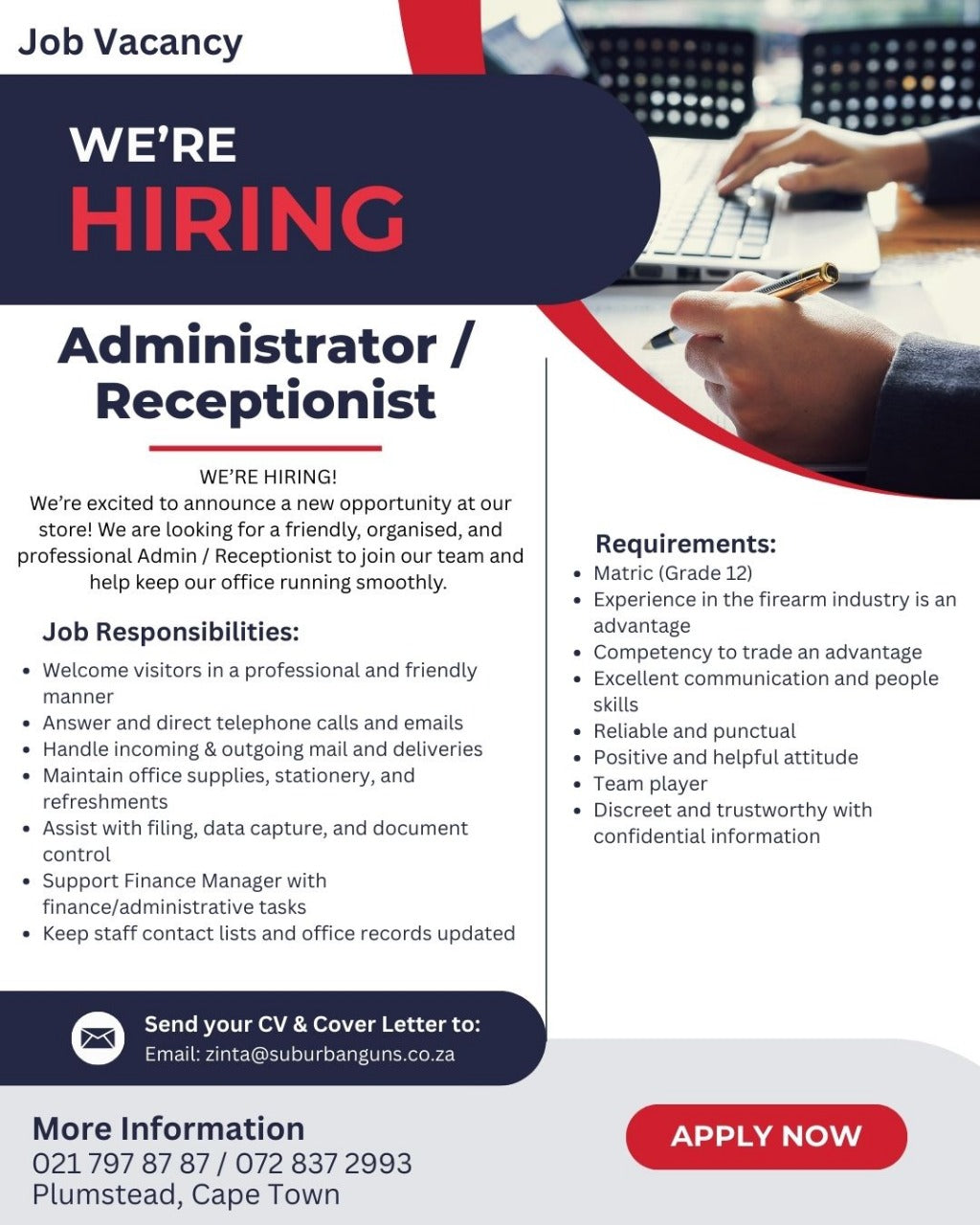 Were excited to announce a new oppertunity at our store! We are looking for a freindly, organized, and professional Admin / Receptionist to join our team.
