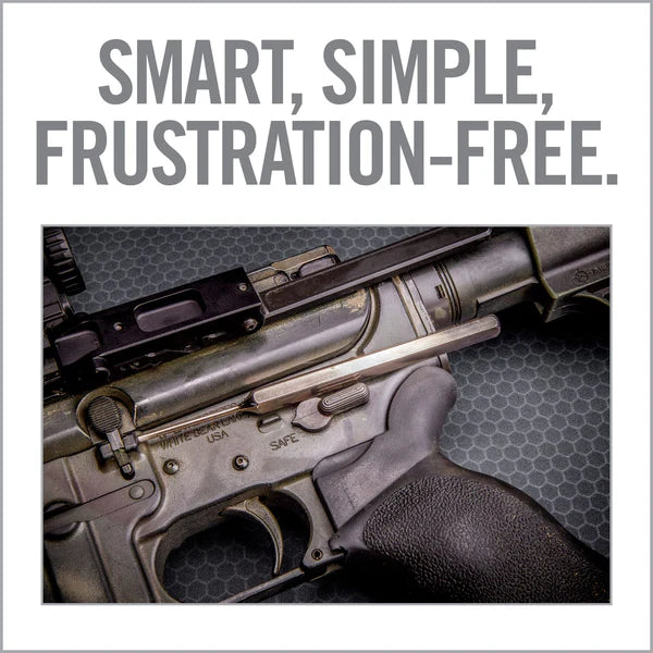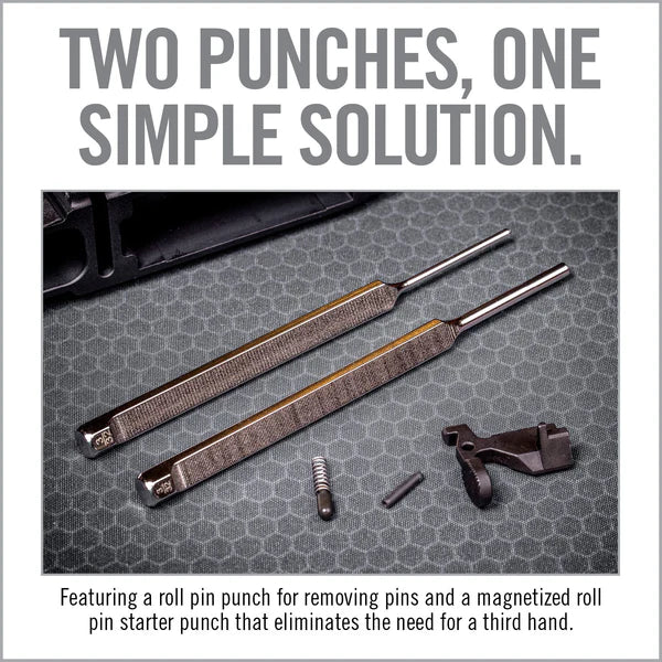 Two punches, one simple solution to the difficult to access bolt catch retaining pin. The orientation of the pin, close proximity to the lower receiver, distance required to safely punch a pin and the difficulty in getting the pin started makes it a real pain with standard punches. Our simple solution is specially designed to fit flush against the receiver without damaging it and is long enough to reach the pin. It features a roll pin punch for removing pins and a magnetized roll pin starter punch that eliminates the need for a third hand. Smart, simple, frustration free.